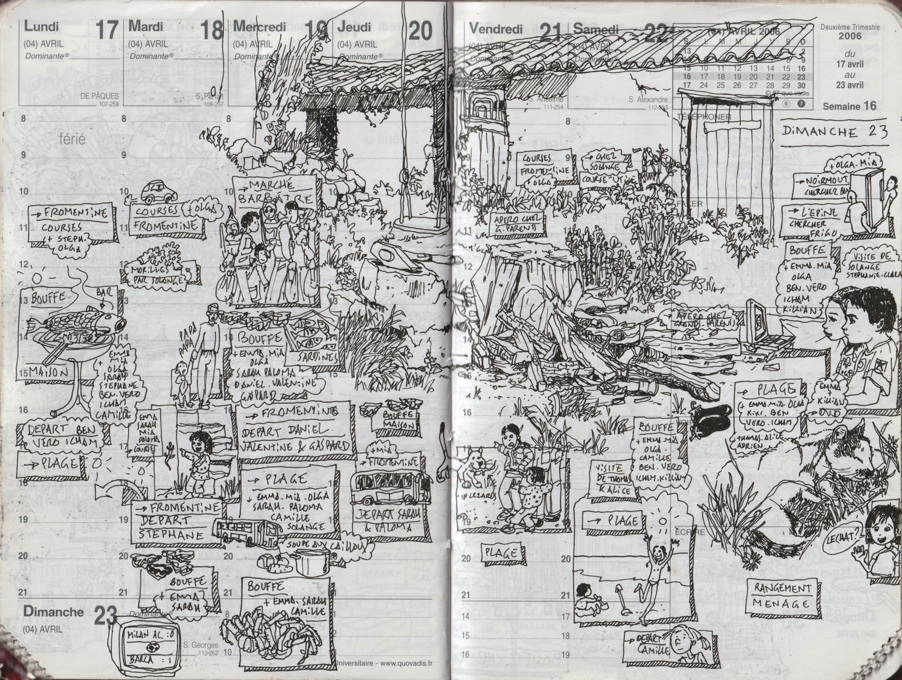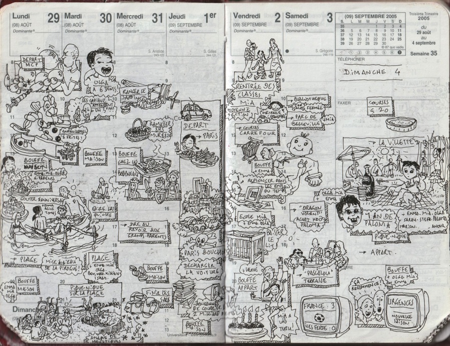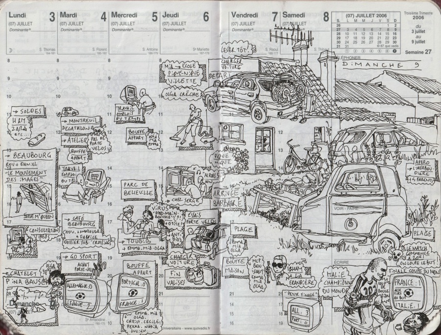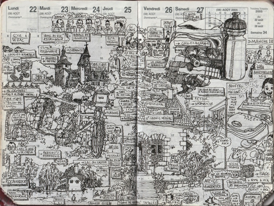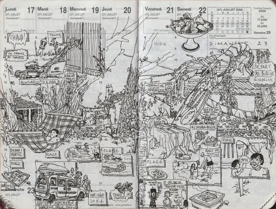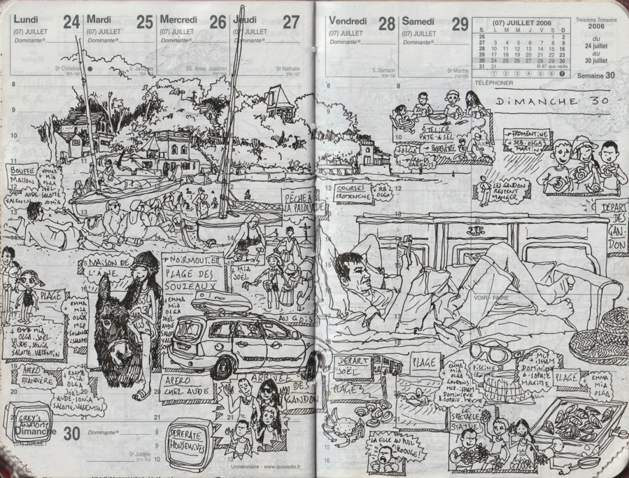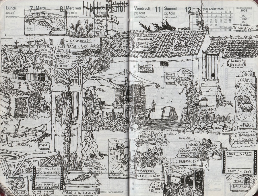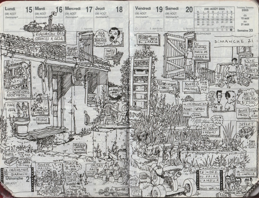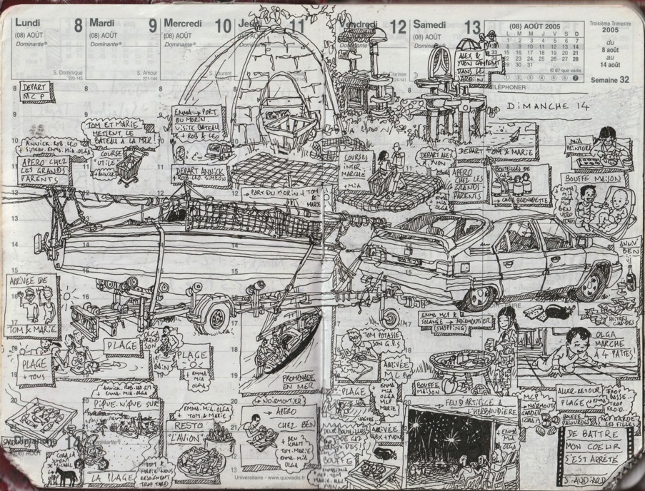 Lundi 8 août 2005, Tom et Marie arrivent avec un voilier remorqué par leur légendaire BX (dessinés ici).