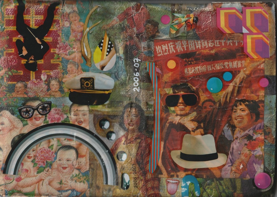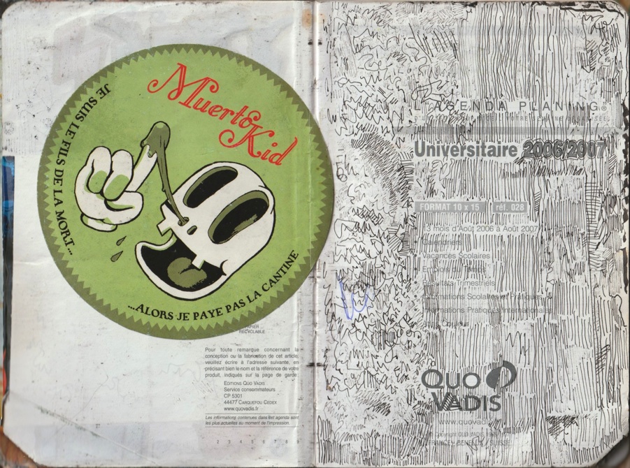 La couverture de cet agenda est customisée avec des autocollants de The Information de Beck (2006). L’album était vendu avec une pochette quadrillée blanche et une planche de stickers.