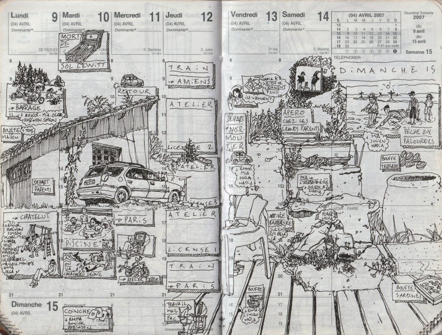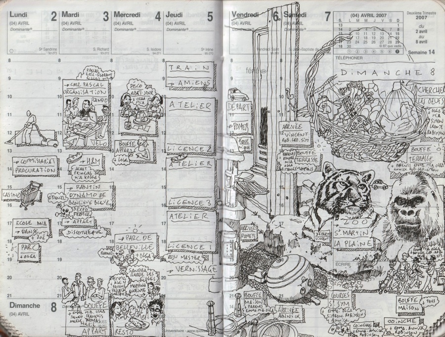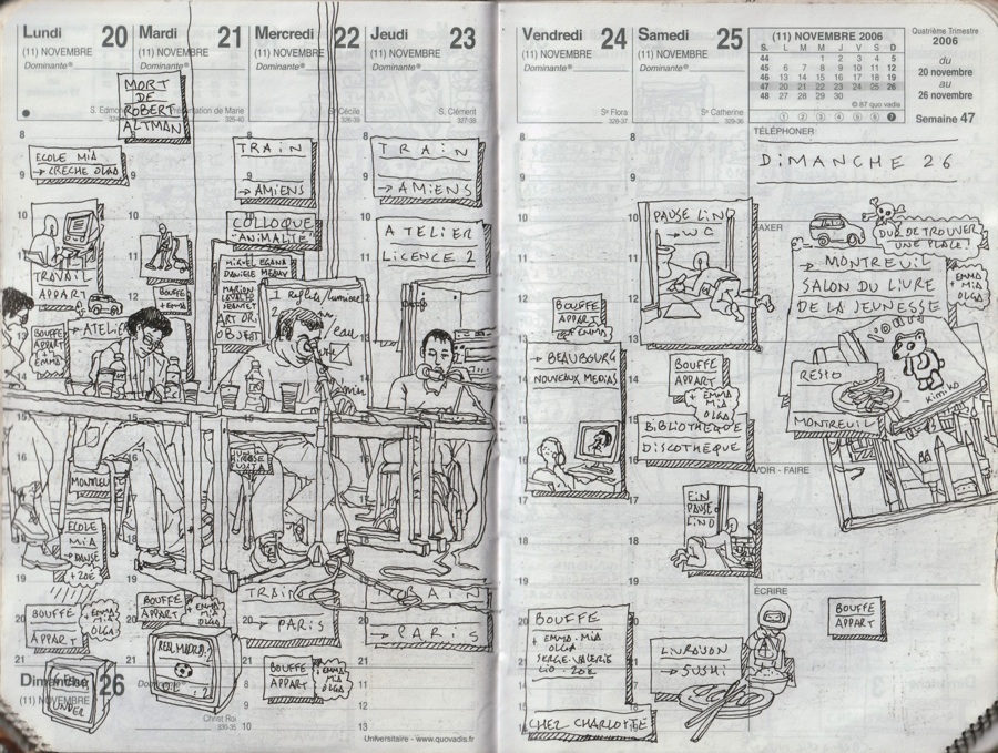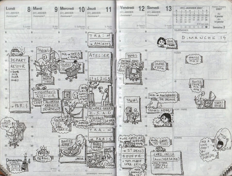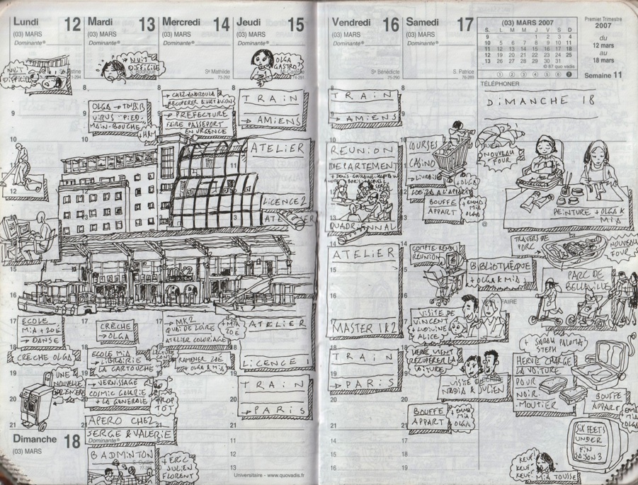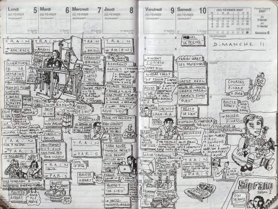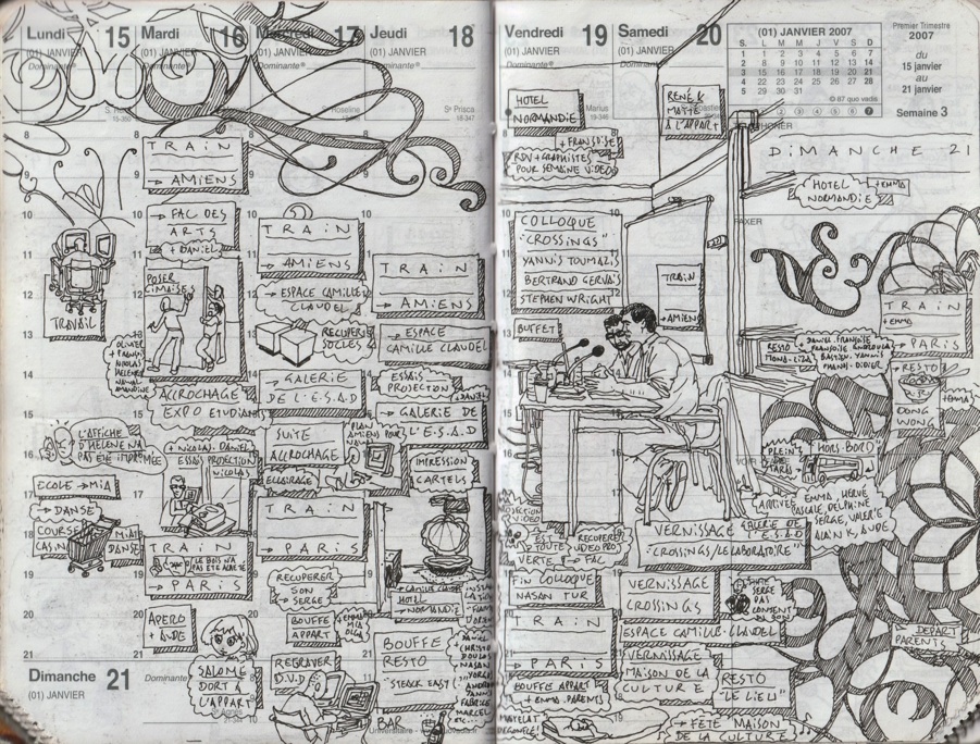 Mardi 16 janvier, semaine consacrée au montage de l’exposition Crossings accompagnée d’un colloque (où je dessine Bertrand Gervais alias Paul Ardenne et Yiannis Toumazis). Le motif qui occupe la double page est l’identité graphique inventée par un étudiant de l’ESAD pour la manifestation.