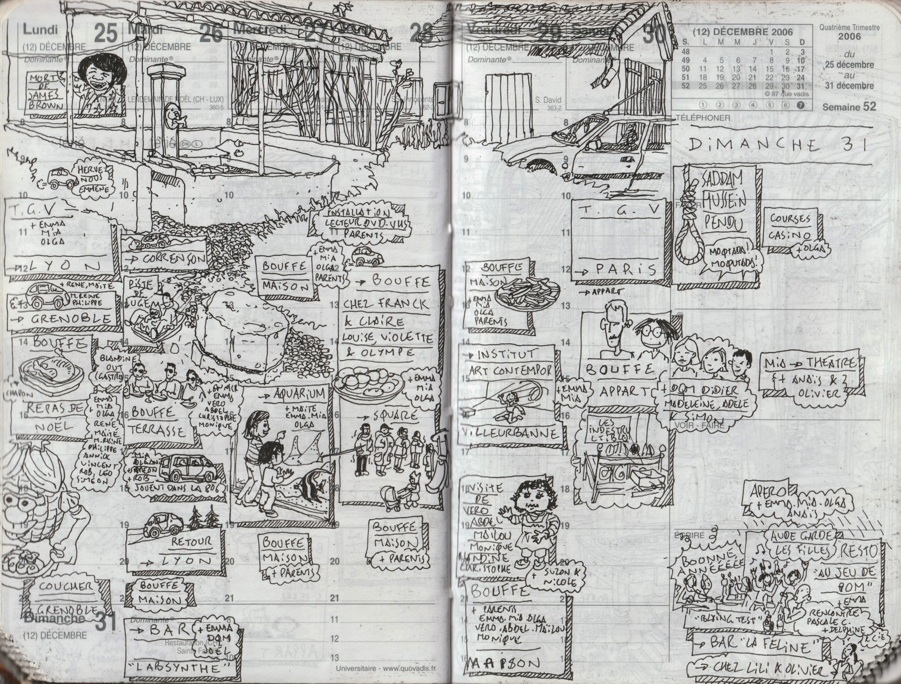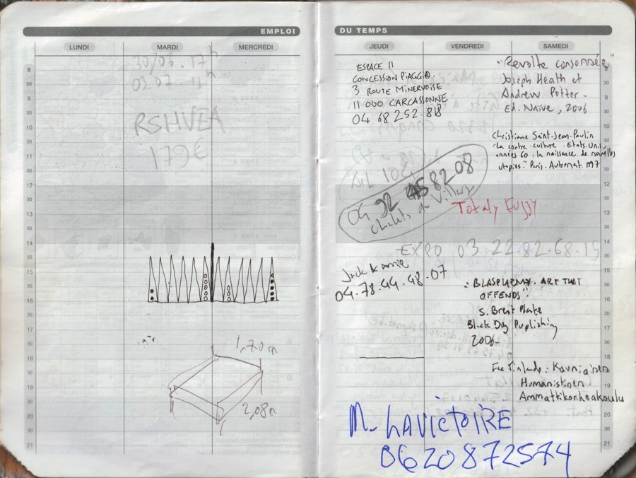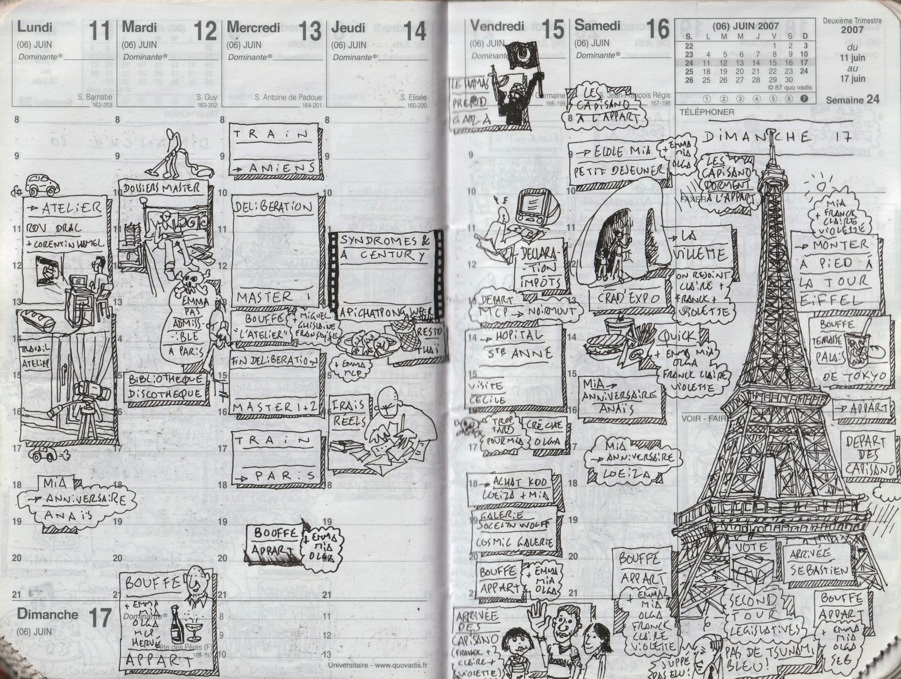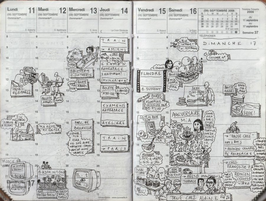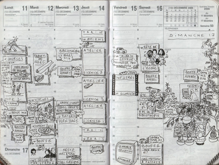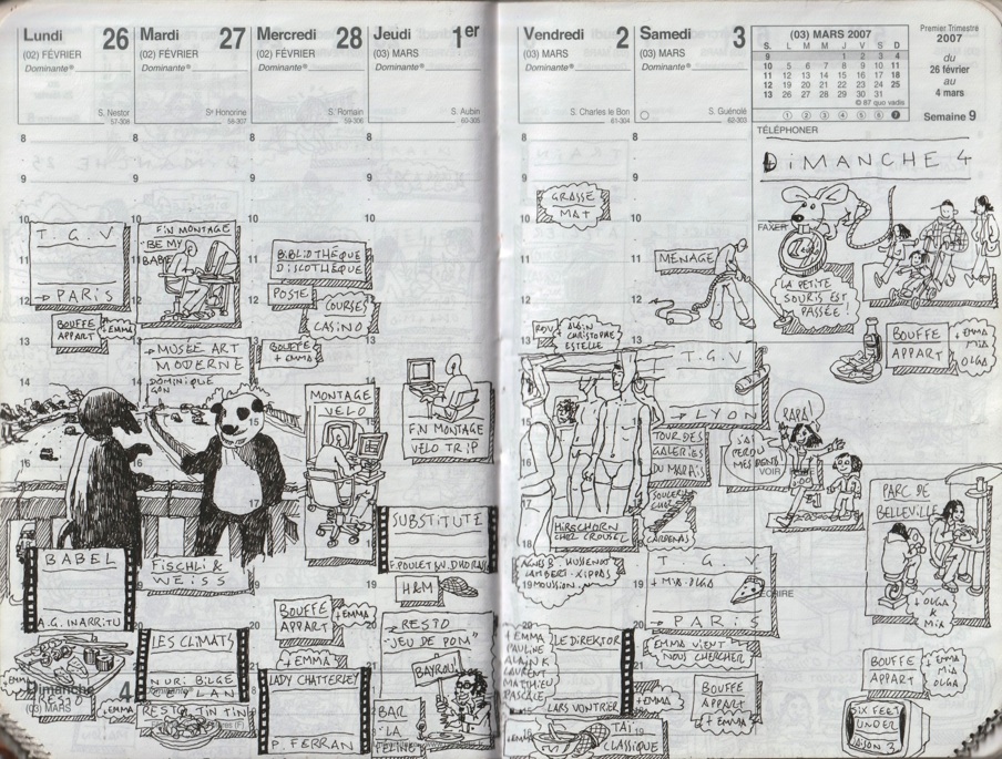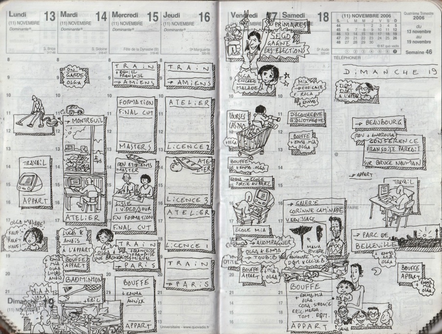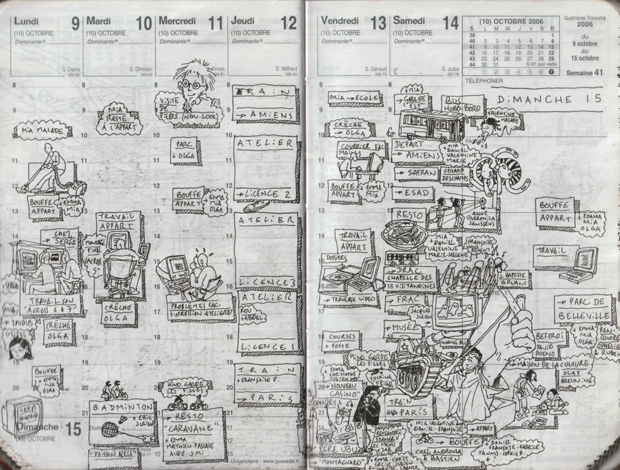 Mardi 16 janvier, semaine consacrée au montage de l’exposition Crossings accompagnée d’un colloque (où je dessine Bertrand Gervais alias Paul Ardenne et Yiannis Toumazis). Le motif qui occupe la double page est l’identité graphique inventée par un étudiant de l’ESAD pour la manifestation.