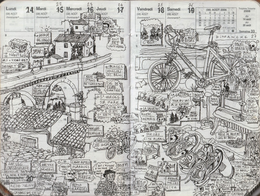 Jeudi 25, après une journée de pluie, nous arrivons dans un gîte tenu par une famille un peu misanthrope, et beaucoup complotiste, abonnée à une surprenante revue Nexus (dont je dessine la couverture « La science nous ment »). Le père fait du Quad et pense que le monde est peuplé de 99% de couillons. Il pleut. La Salvetat ne nous fait pas rêver. J’ai vidé le ballon d’eau chaude. Mon pneu est crevé. Blues. Heureusement Gilles anime notre journée en relevant le défi de descendre vers le lac à pied, vélo sur l’épaule. Absurde donc joyeux.