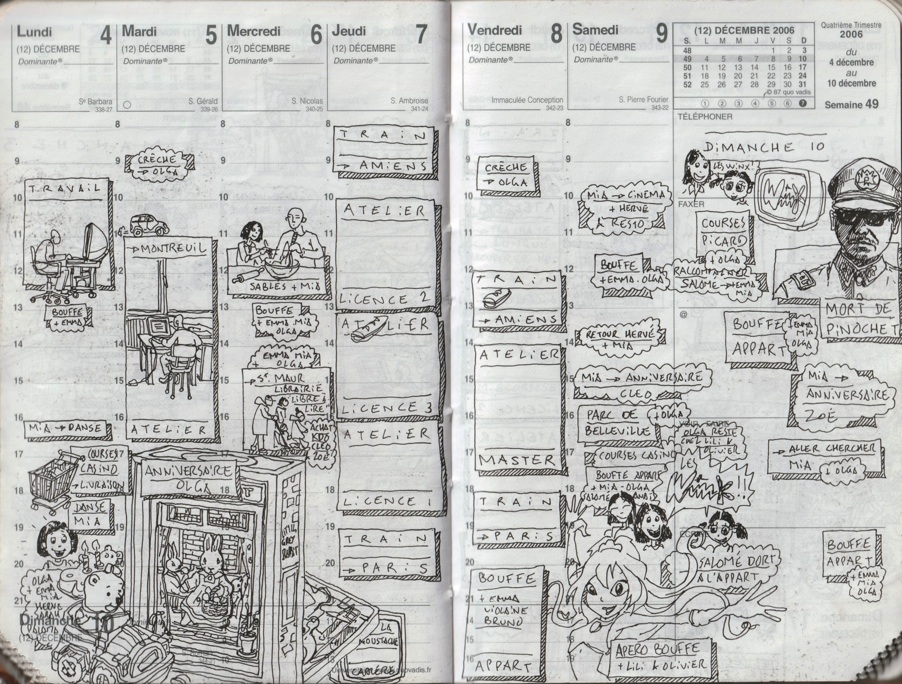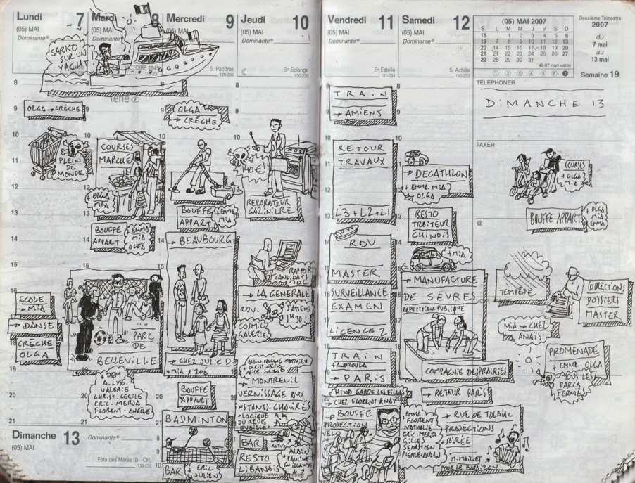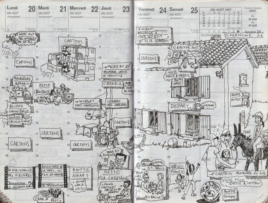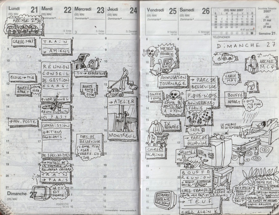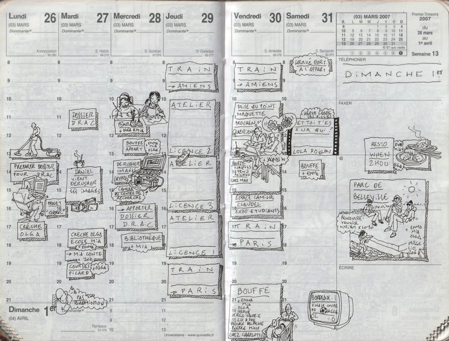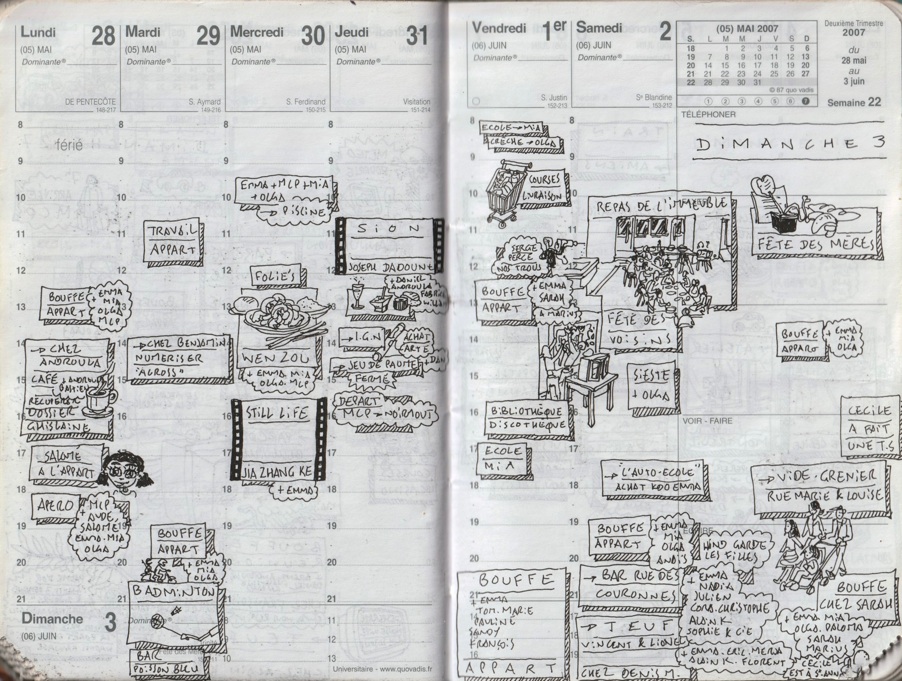 Sur les pages « emploi du temps », un aide-mémoire de la position des pions de backgammon, dessiné dans un café chypriote.