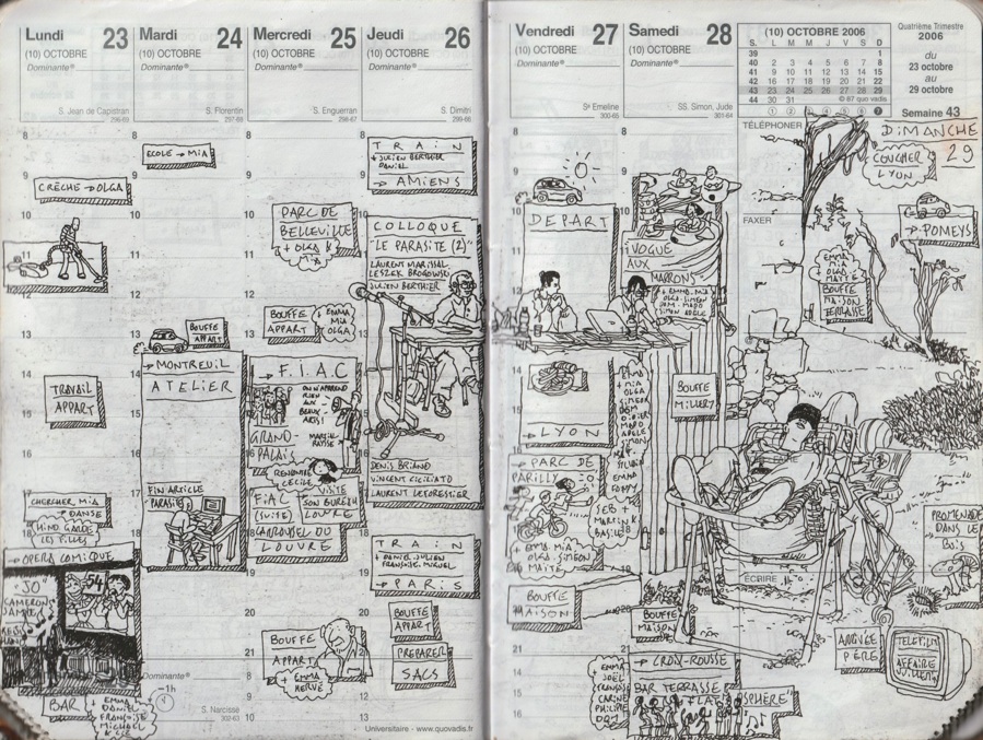 Jeudi 26 octobre, j’ai invité Julien Berthier à participer à un colloque sur la notion de Parasite. Il m’a confié récemment que c’est la première fois qu’il a été invité à une conférence. Je crois que c’est le premier artiste que j’ai invité. En bout de table, je dessine Denis Briand que je rencontre aussi pour la première fois ou presque.