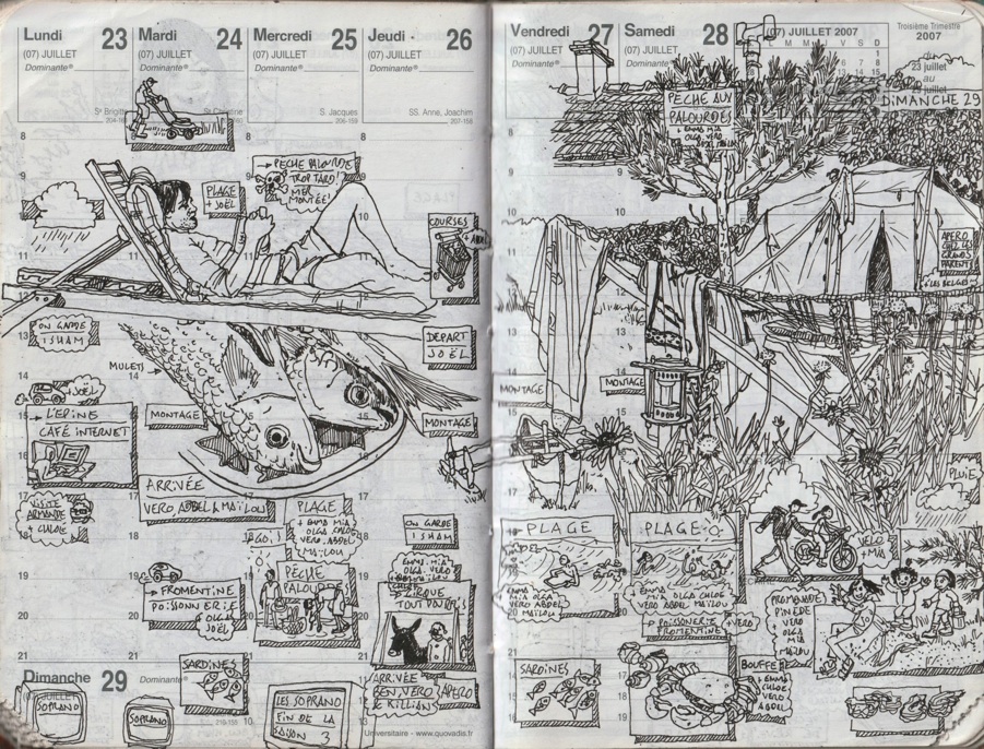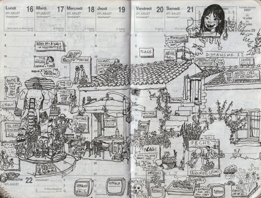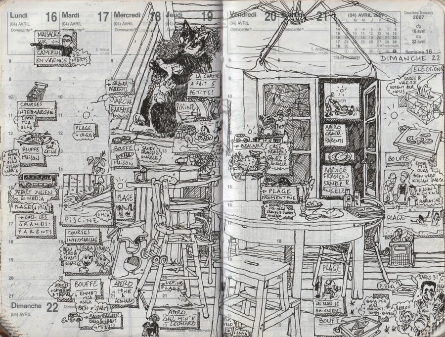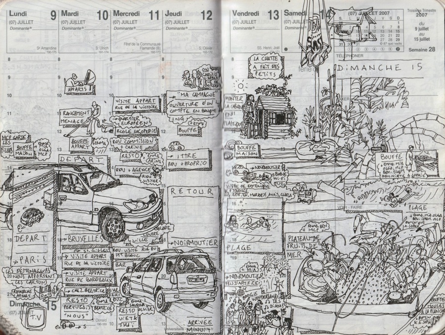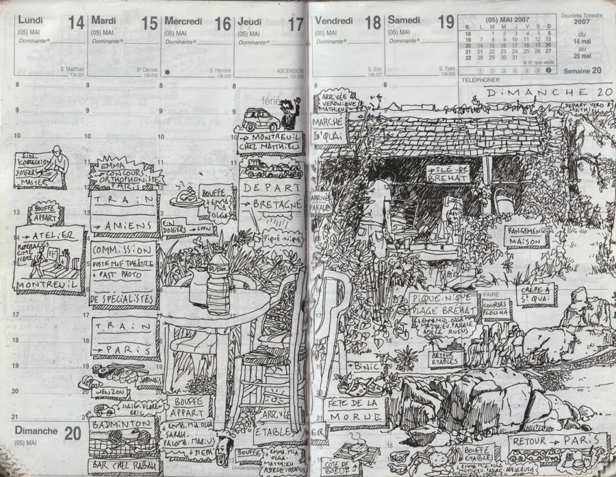 Jeudi 17 mai, départ en Bretagne avec Matthieu & Pascale’s Family, pour un week-end de l’ascension à Étables-sur-Mer. Petit croquis du barbecue au fond du jardin et de la plage de Bréhat beaucoup plus belle que ce dessin. Dimanche 20-lundi 21 : plus jamais de départ en grand week-end par la route.