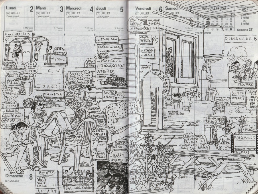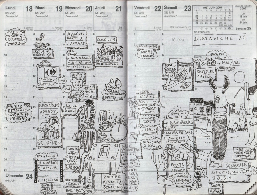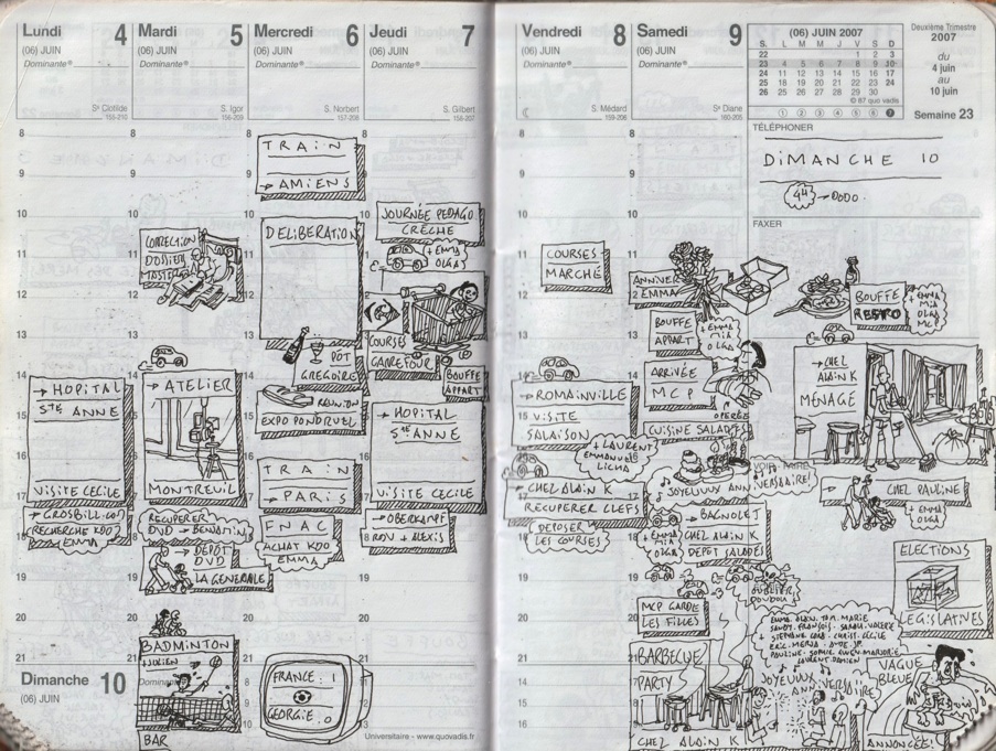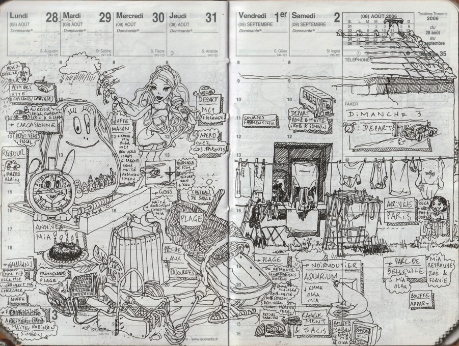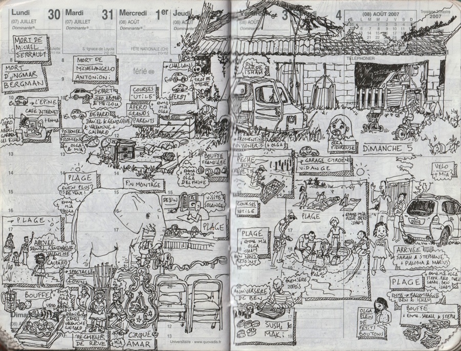 Jeudi 17 mai, départ en Bretagne avec Matthieu & Pascale’s Family, pour un week-end de l’ascension à Étables-sur-Mer. Petit croquis du barbecue au fond du jardin et de la plage de Bréhat beaucoup plus belle que ce dessin. Dimanche 20-lundi 21 : plus jamais de départ en grand week-end par la route.