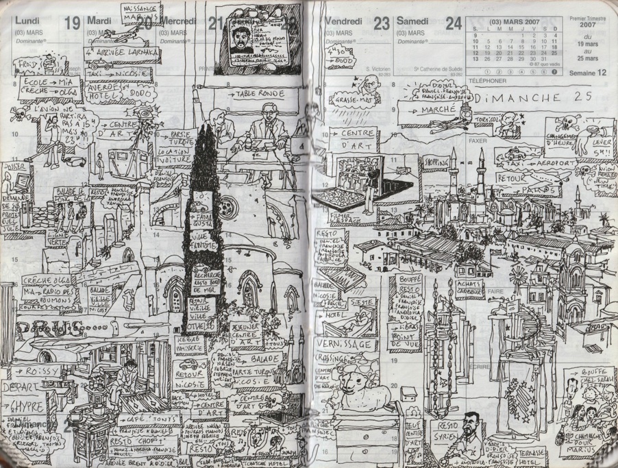 Lundi 19 mars 2007, départ pour Chypre à l’occasion de la dernière étape du projet Crossings, avec quelques étudiant·es. Même si nous connaissions son histoire, découvrir la réalité de la division de Nicosie, les miradors, sacs de sables et buffer zone, est un vrai choc. Petit croquis de Françoise Coblence pendant une partie de backgammon dans un café du vieux centre. Brent Klinkum arrive le soir. Triste d’écrire leurs deux noms alors qu’elle et il ne sont plus de ce monde.