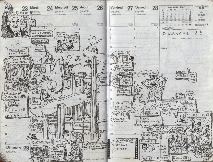Lundi 23 avril, mort de Boris Eltsine. Je le dessine avec une bouteille de vodka. À bien y réfléchir, il est à l’origine de l’état actuel de la Russie, avec des privatisations sauvages au profit d’une bande d’oligarques, la corruption généralisée, la première guerre de Tchétchénie et l’arrivée au pouvoir de Poutine. On connaît meilleur bilan.