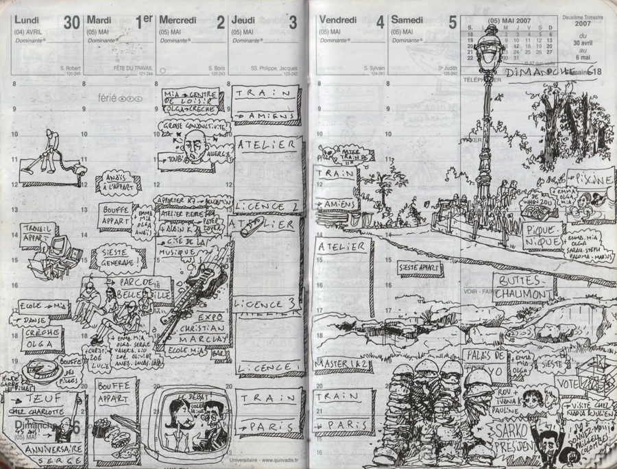 Dimanche 6 mai 2007, après un pique-nique au Buttes-Chaumont (croquis), nous assistons accablés à la victoire de Sarkozy, fêtée place de la Concorde avec une brochette de personnalités toutes aussi moisies mais moins habitées que les oranges de Blazy, consacrée par la performance apocalyptique de Mireille Mathieu. Le cauchemar a commencé.