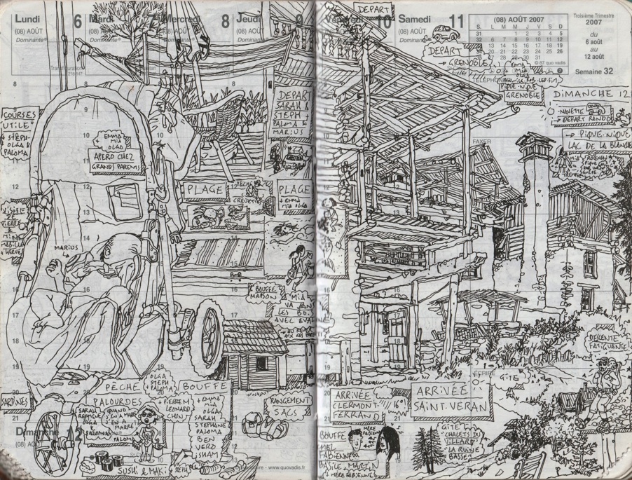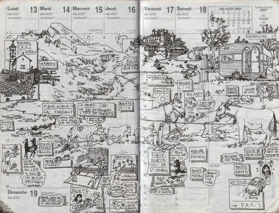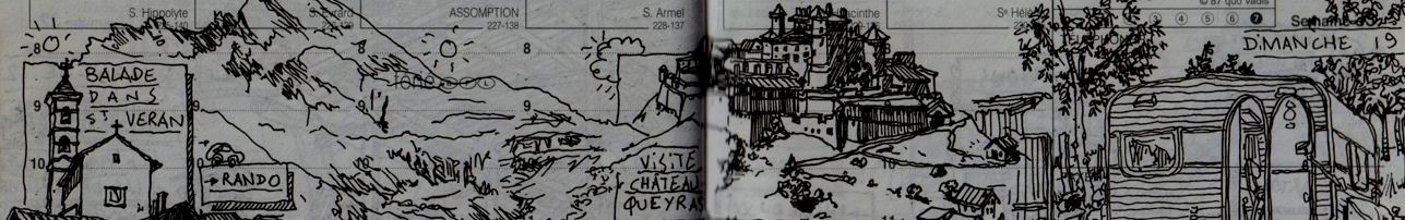 Samedi 11 août, départ pour Saint-Véran où nous rejoignons ma sœur Annick et ses enfants aux Chalets du Villard (dessinés ici). Dans ce site magnifique, l’ambiance du séjour est bizarre : quelques jours auparavant, Vincent a dit à Annick qu’il la quittait. Les enfants ne sont pas au courant.