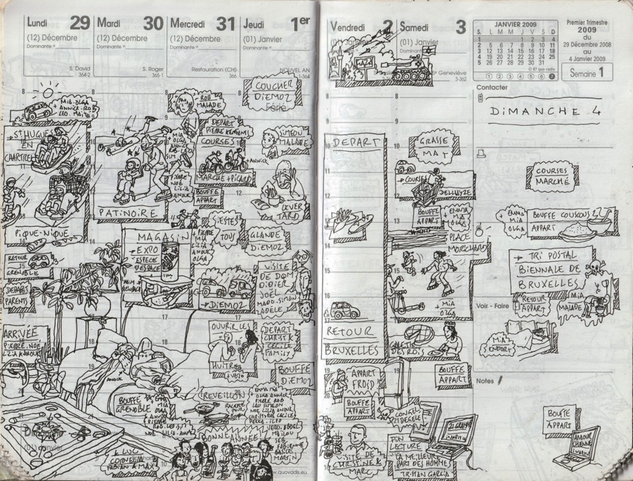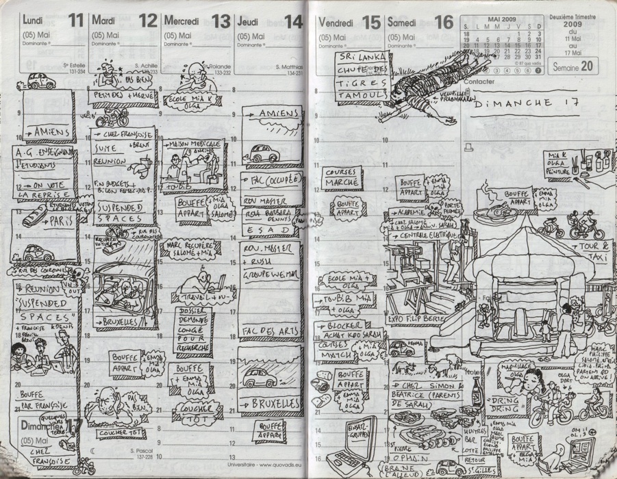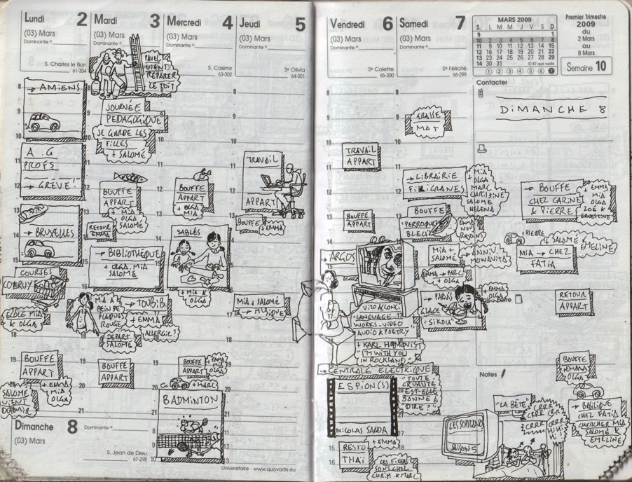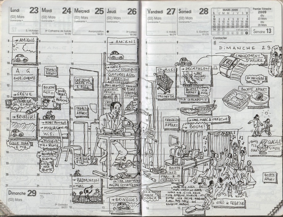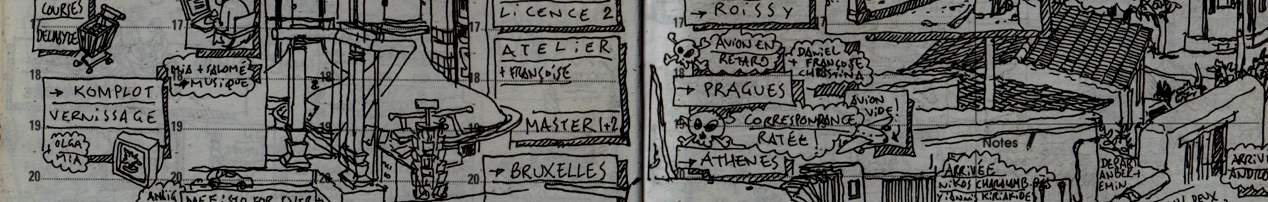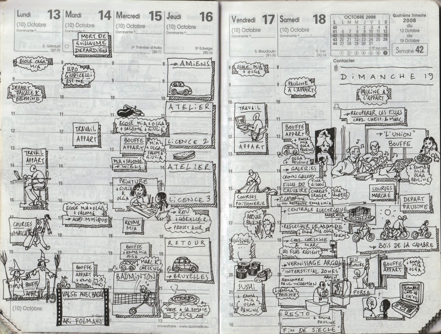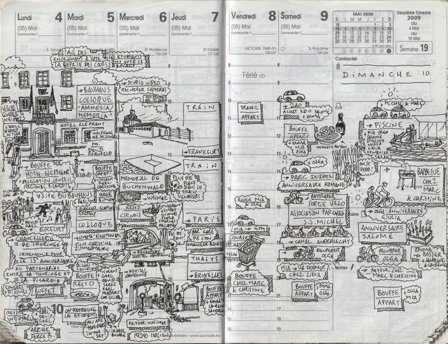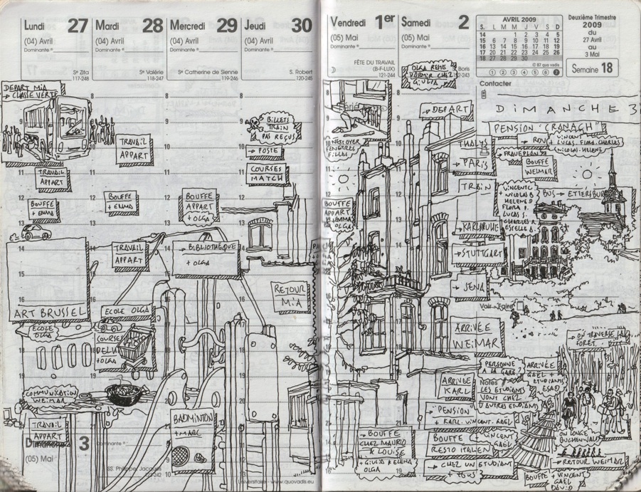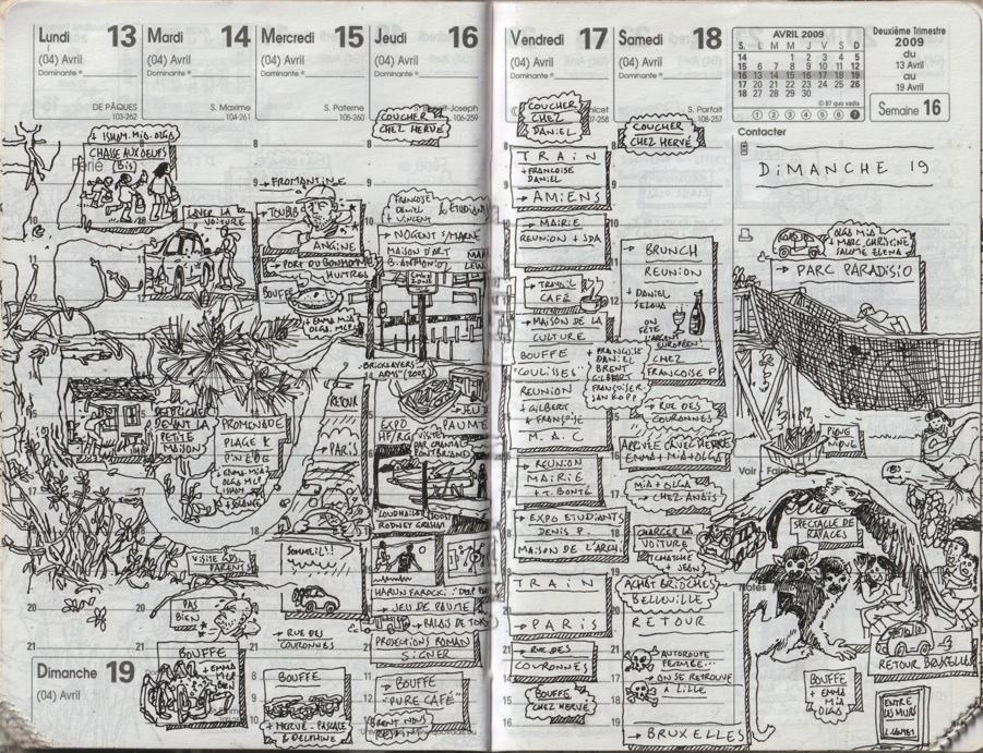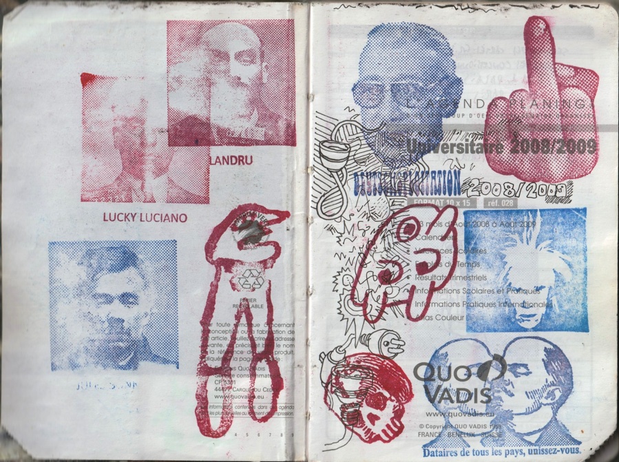 Dans le revers de ce 18e agenda, un dessin d’Olga. En face, un autocollant volé dans un train allemand. La série de tampons des pages suivantes a-t-elle été empruntée au tampographe Sardon ?