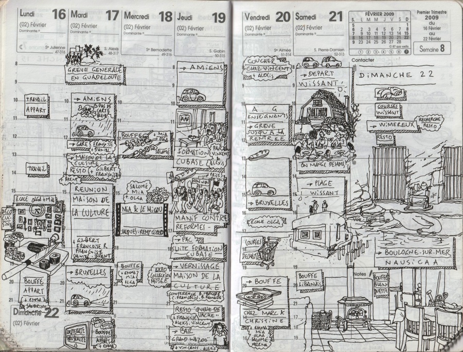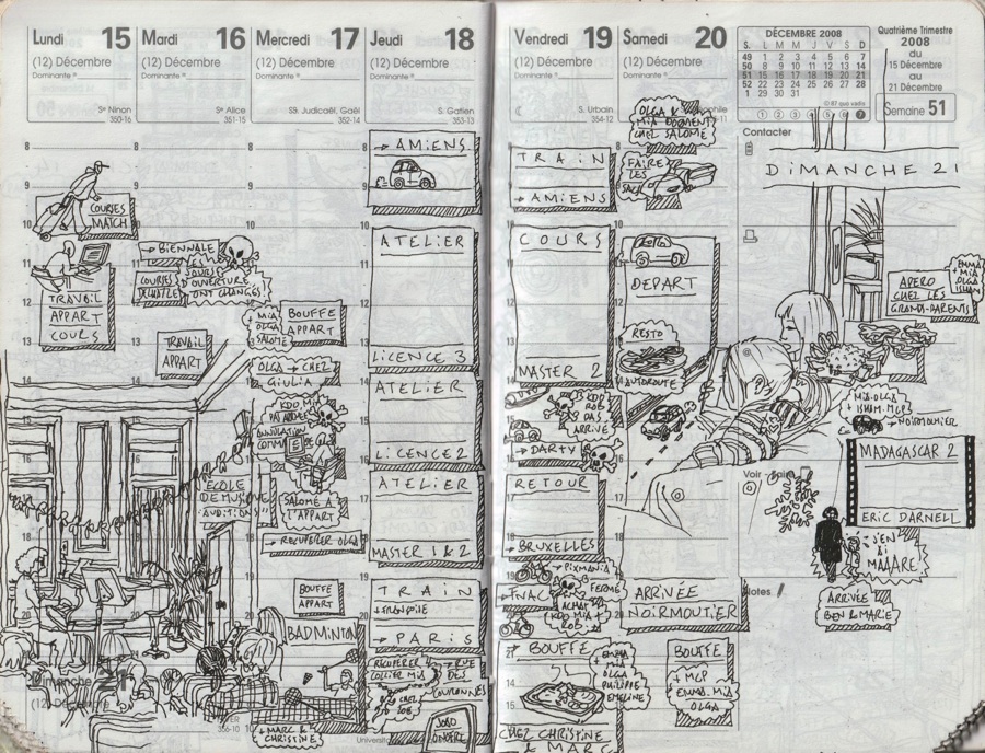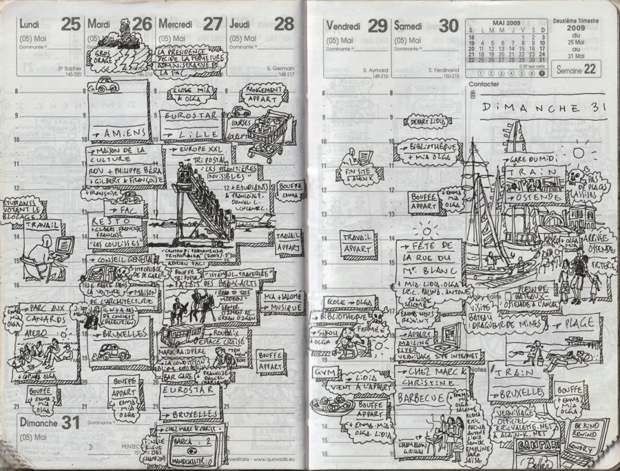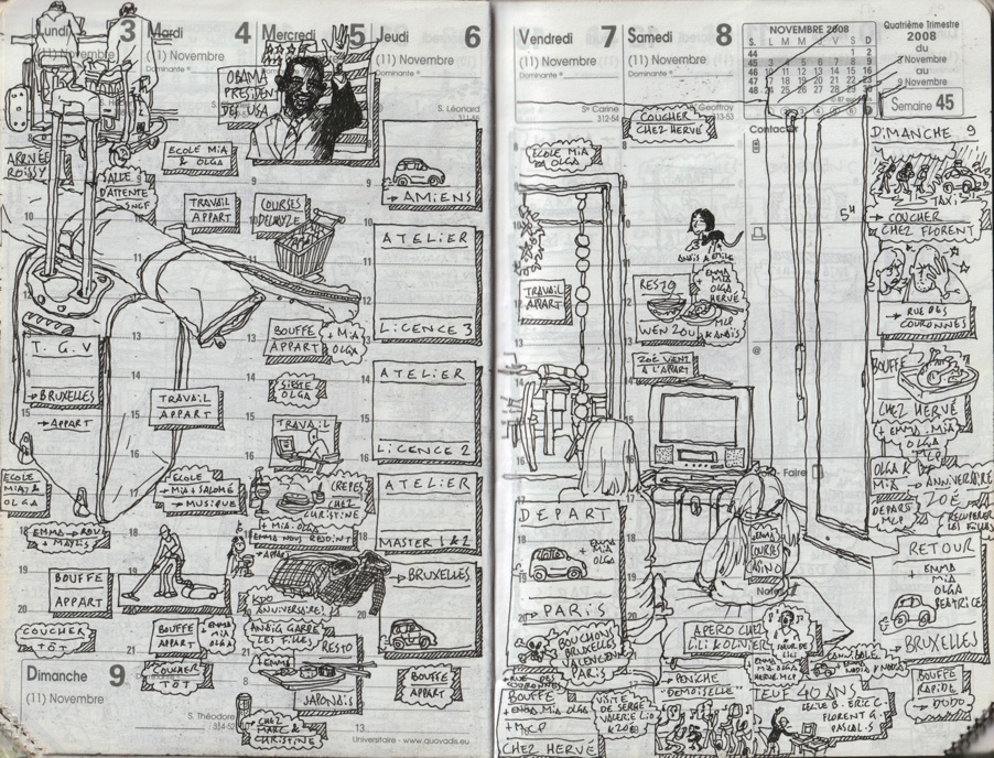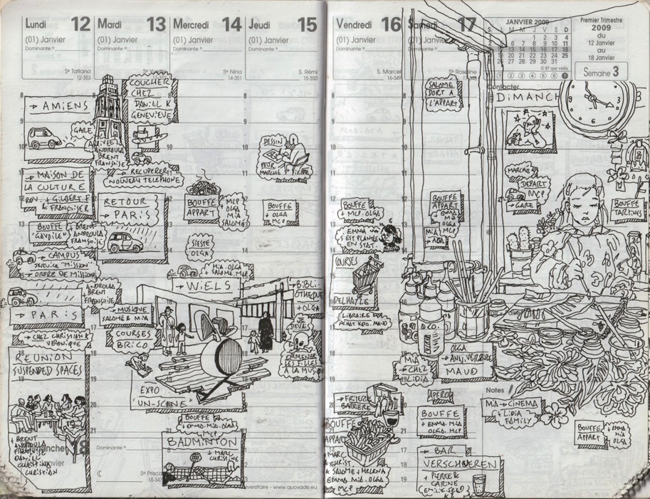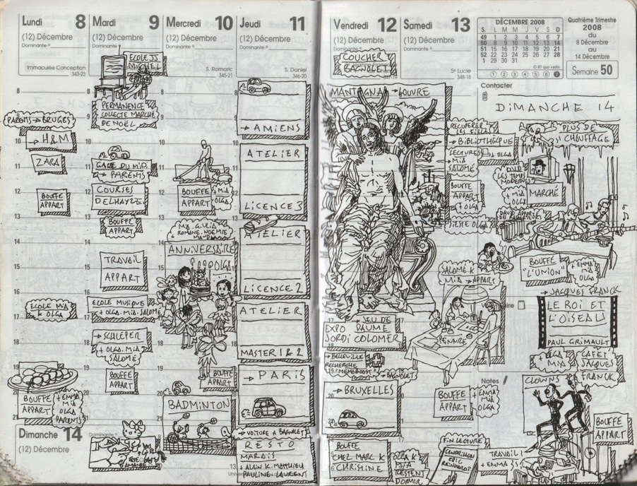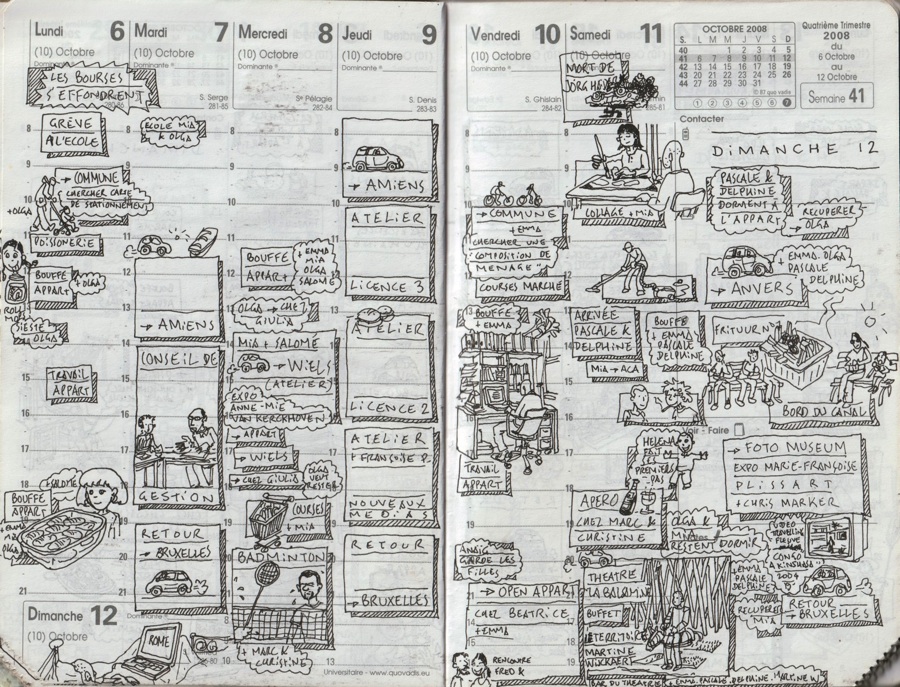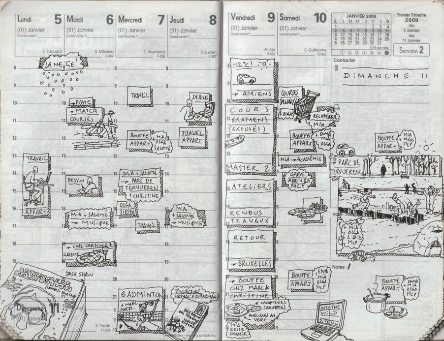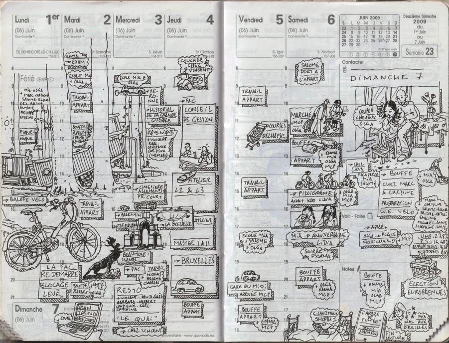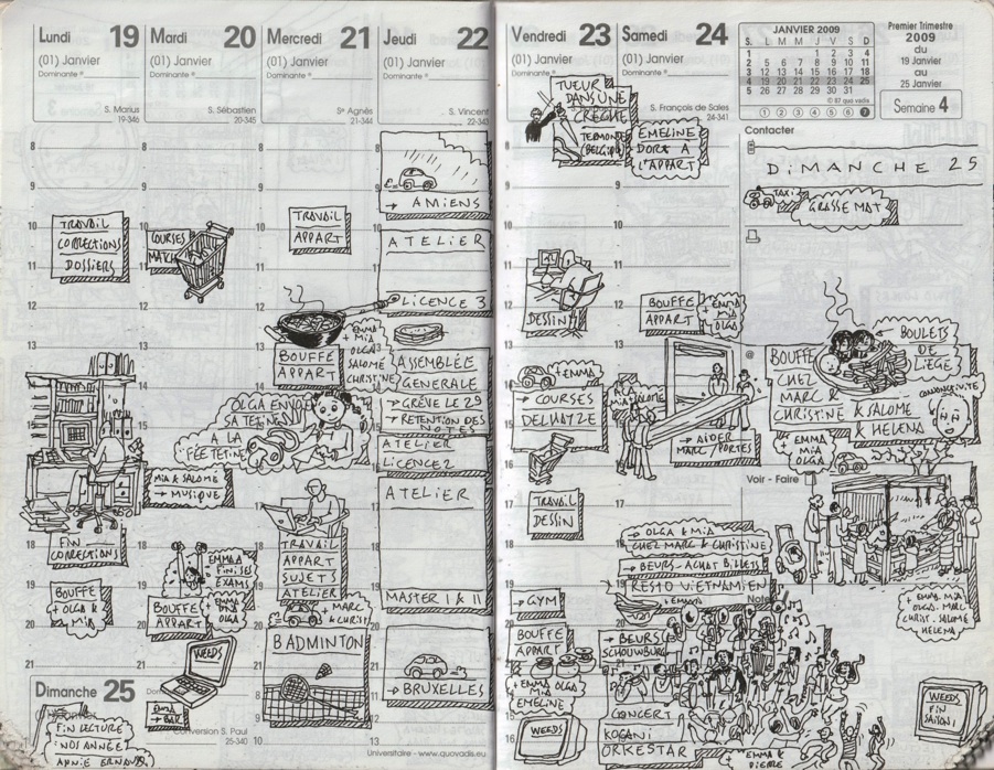 Dans le revers de ce 18e agenda, un dessin d’Olga. En face, un autocollant volé dans un train allemand. La série de tampons des pages suivantes a-t-elle été empruntée au tampographe Sardon ?