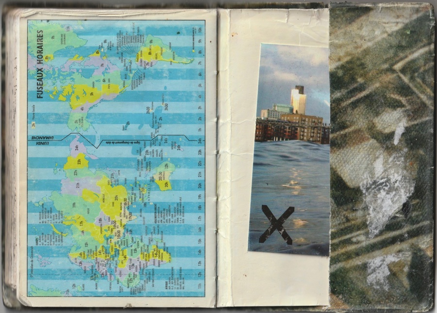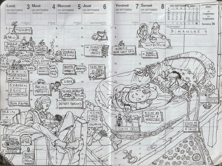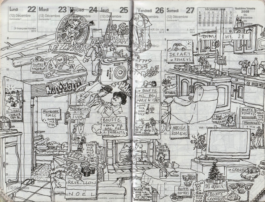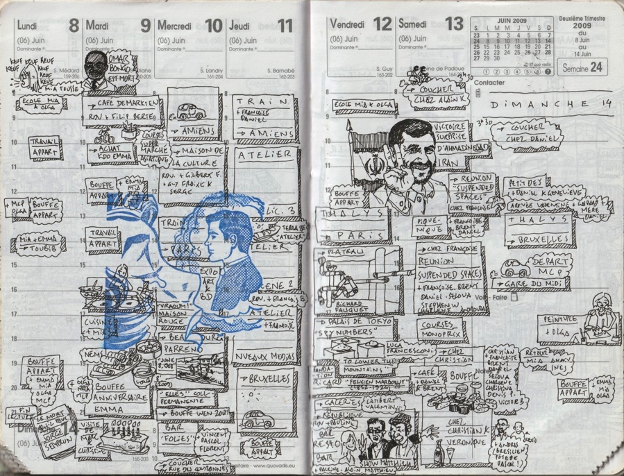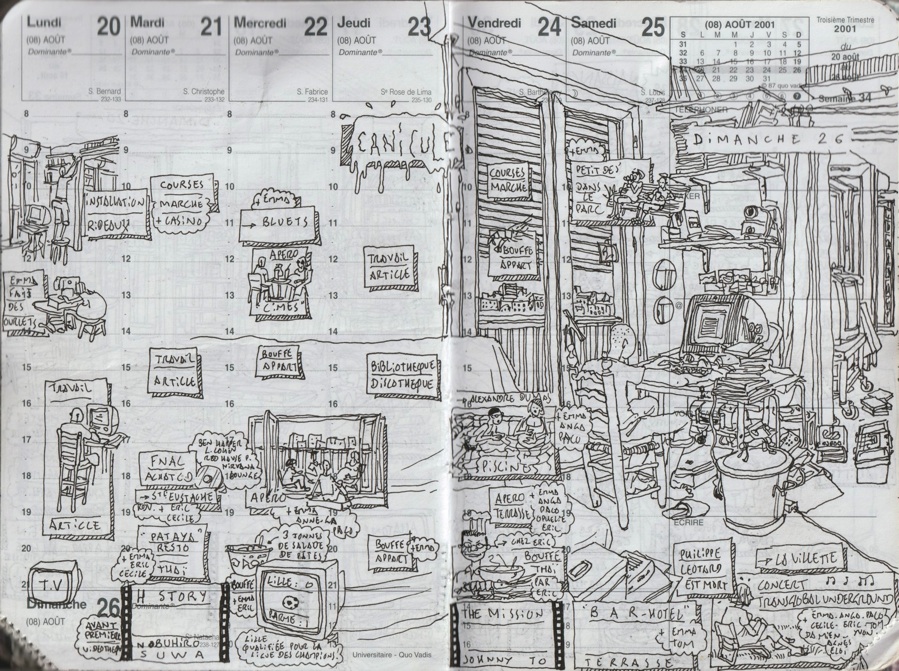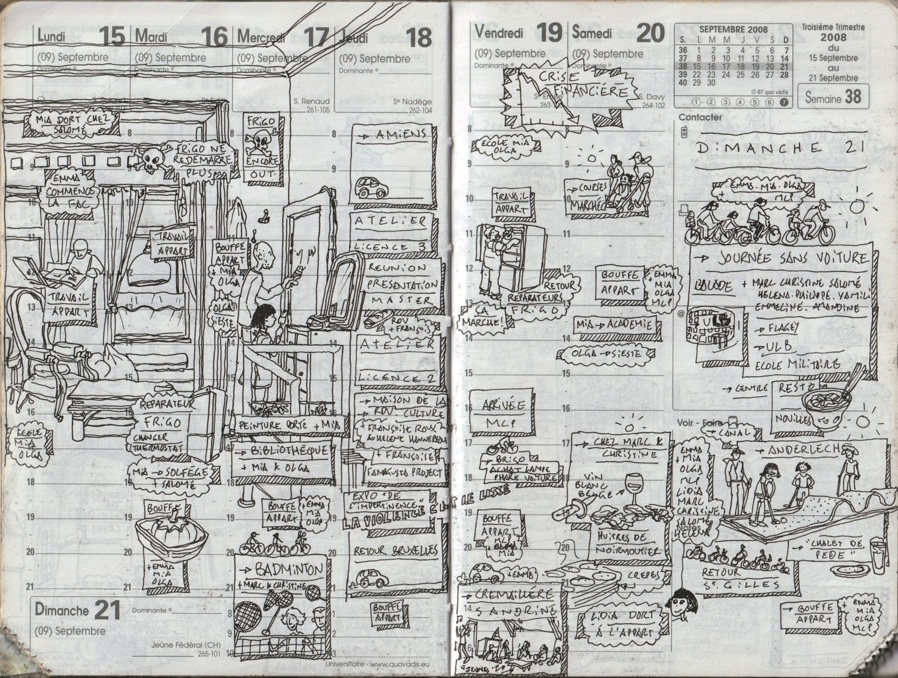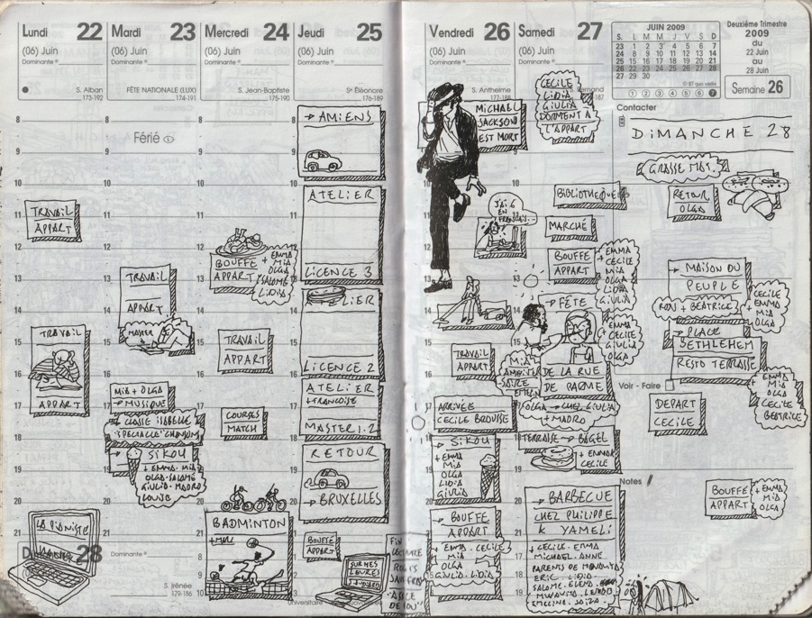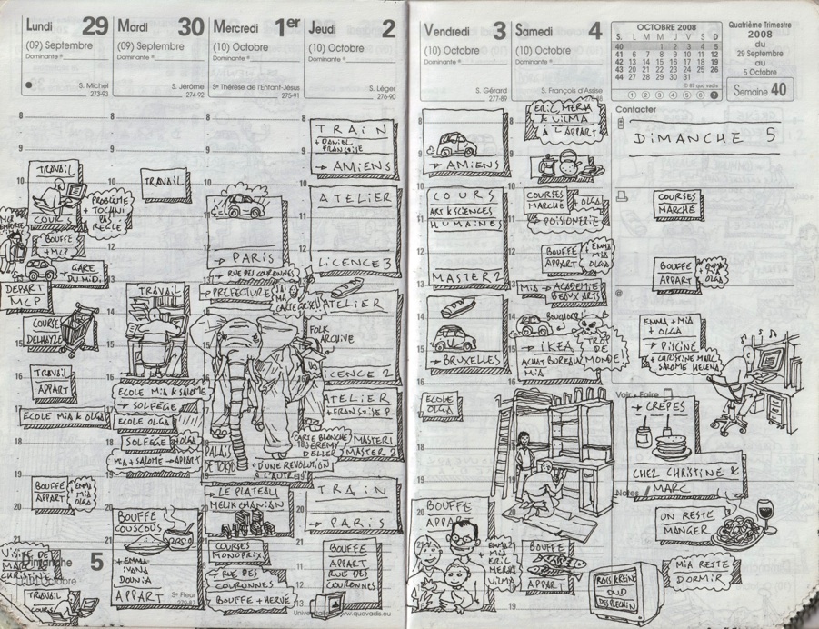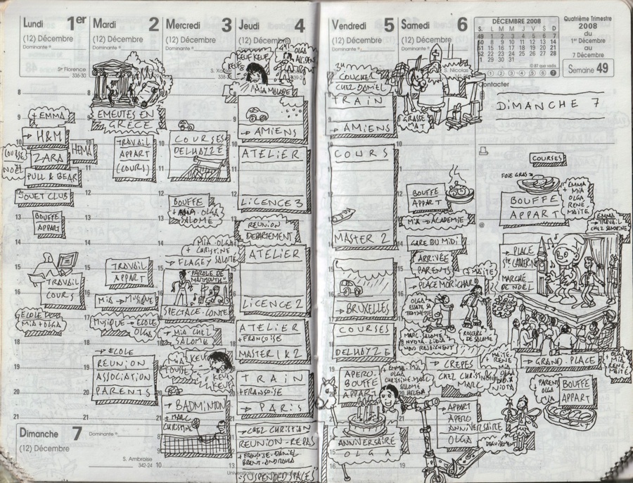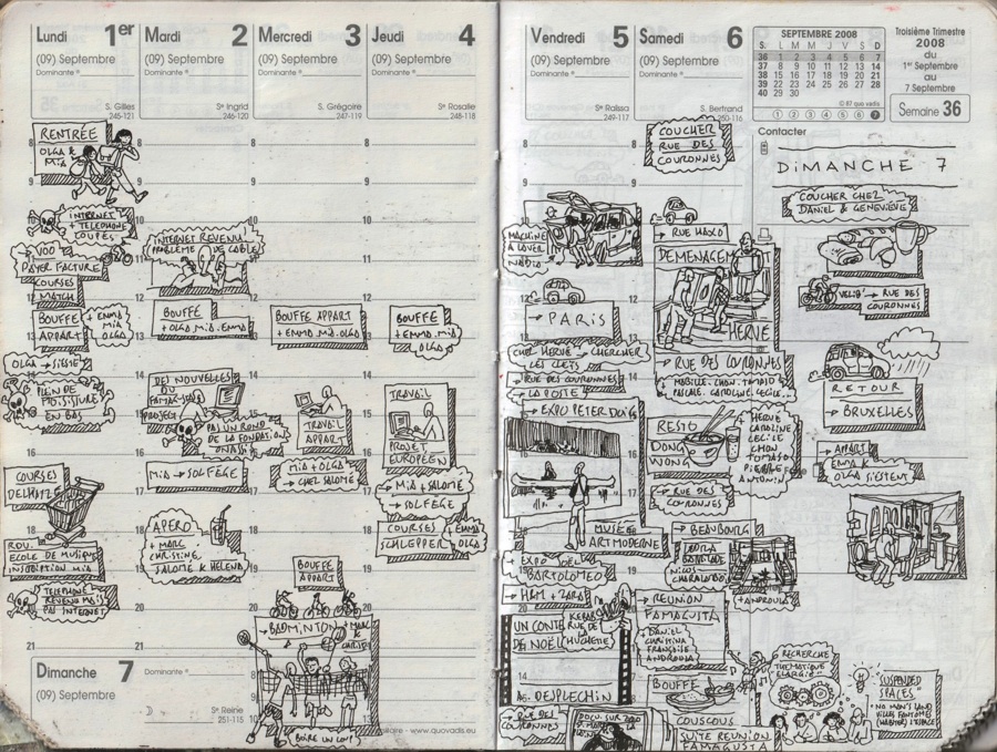 Dans le revers de ce 18e agenda, un dessin d’Olga. En face, un autocollant volé dans un train allemand. La série de tampons des pages suivantes a-t-elle été empruntée au tampographe Sardon ?